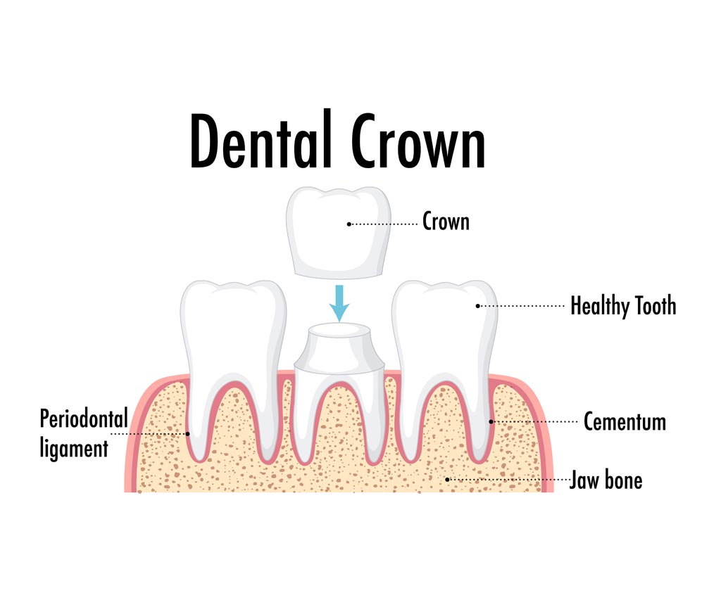 A dental crown is a cap that completely covers a damaged or weakened tooth to restore its shape, size, strength, and appearance.